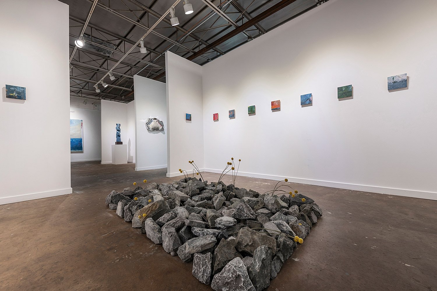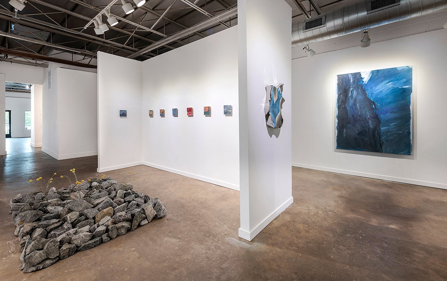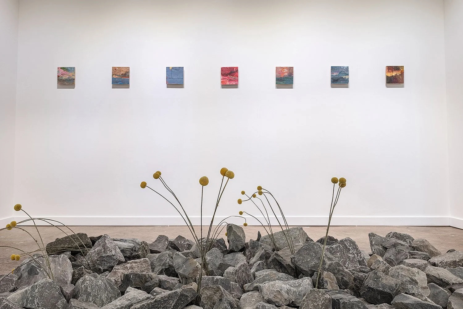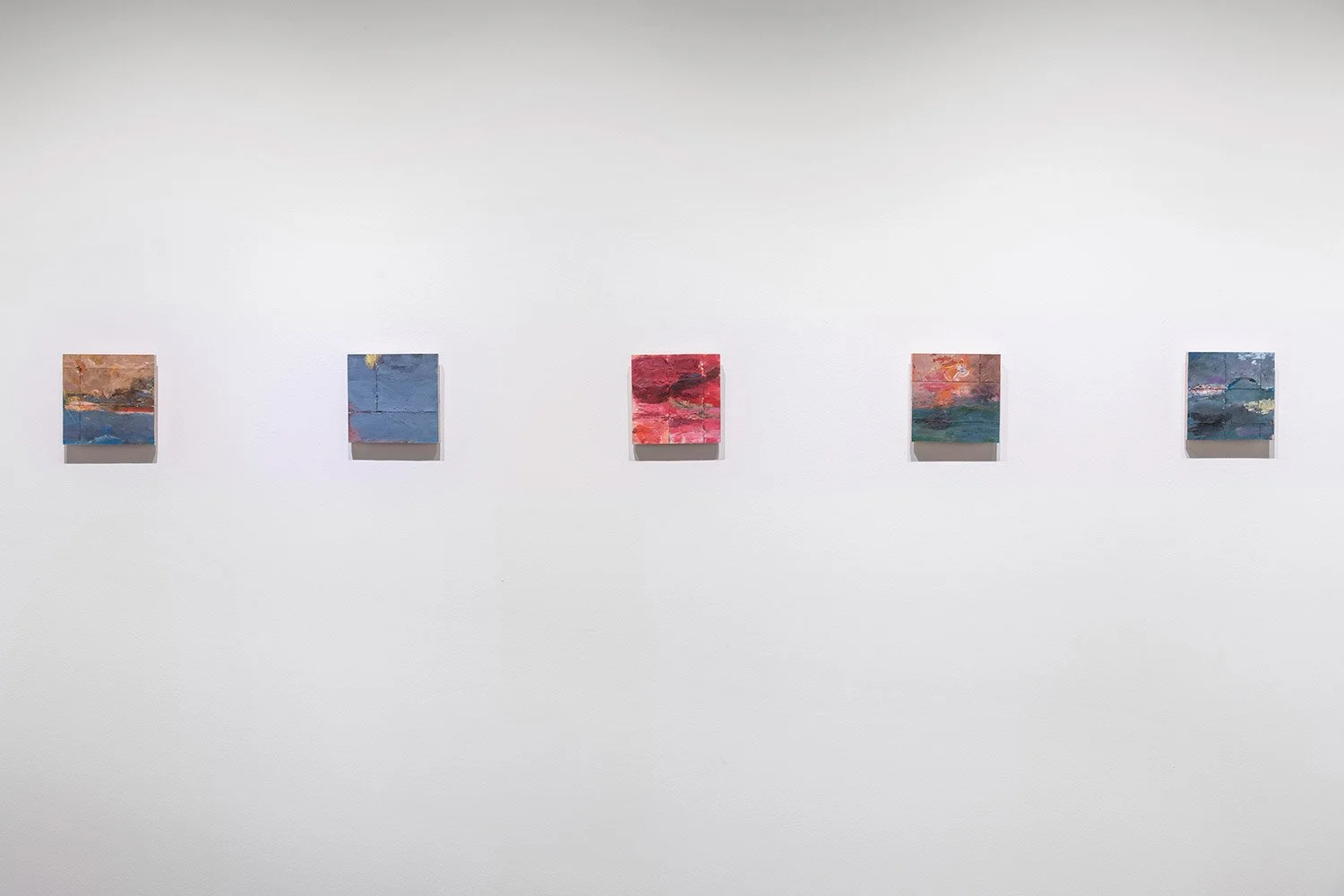 Smaller works introduce fractures within the painted field. Cuts through the surface interrupt and expose the structure beneath, suggesting a fragility shaped by loss and renewal. Together, the works inhabit a space of transition where atmosphere shifts, time lingers, and meaning unfolds.